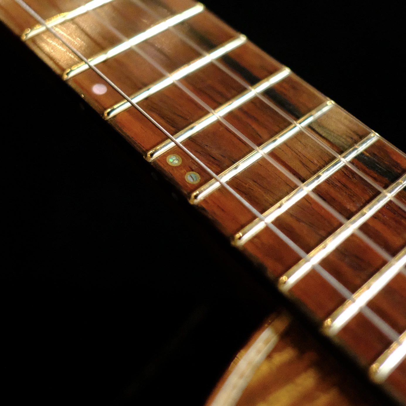明るいカラーのココボロ指板に、Jescor EVO Gold フレットと、